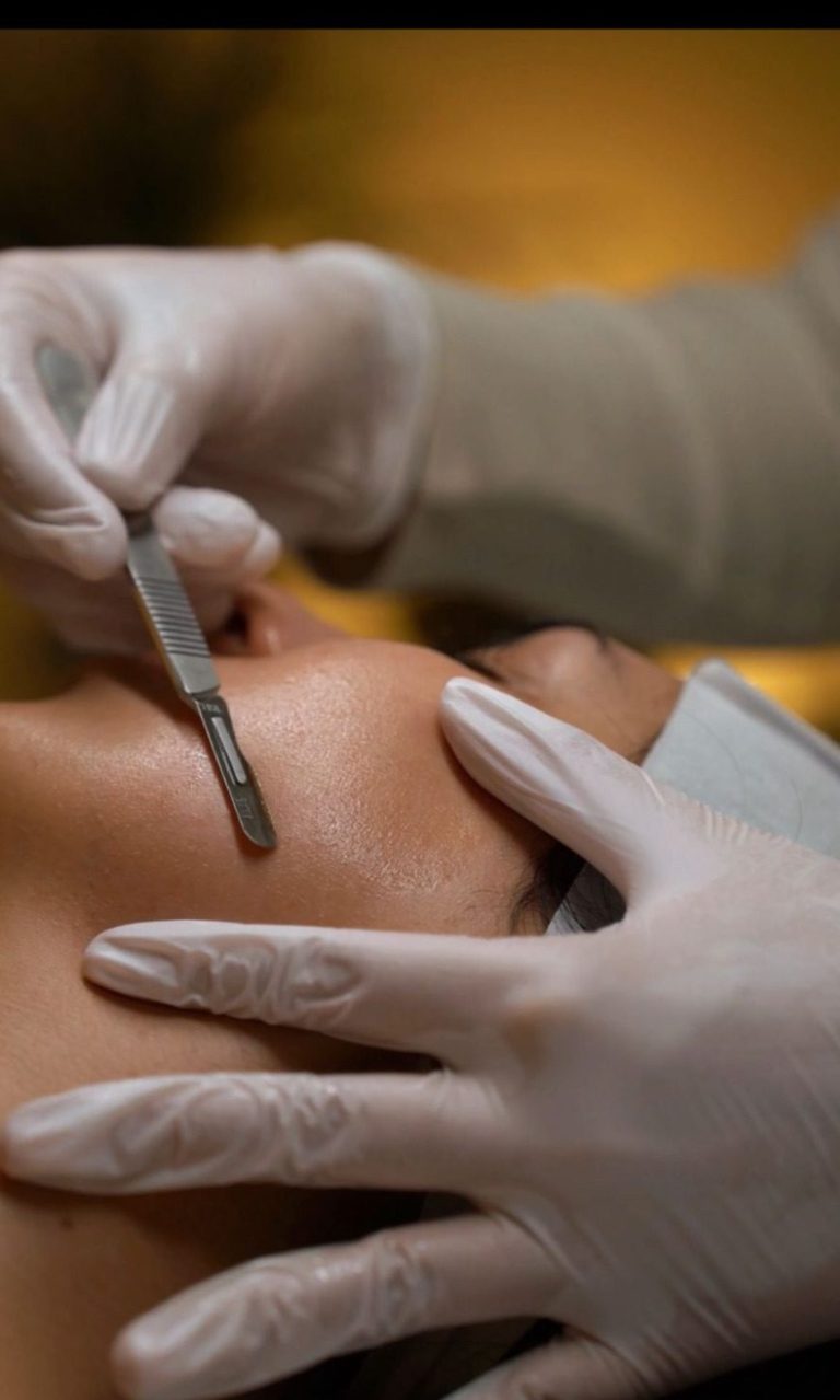 Dermaplaning entfernt sanft abgestorbene Hautzellen und feine Härchen und sorgt sofort für ein glattes, frisches Hautbild mit Glow – ein leichter Peeling-Effekt.